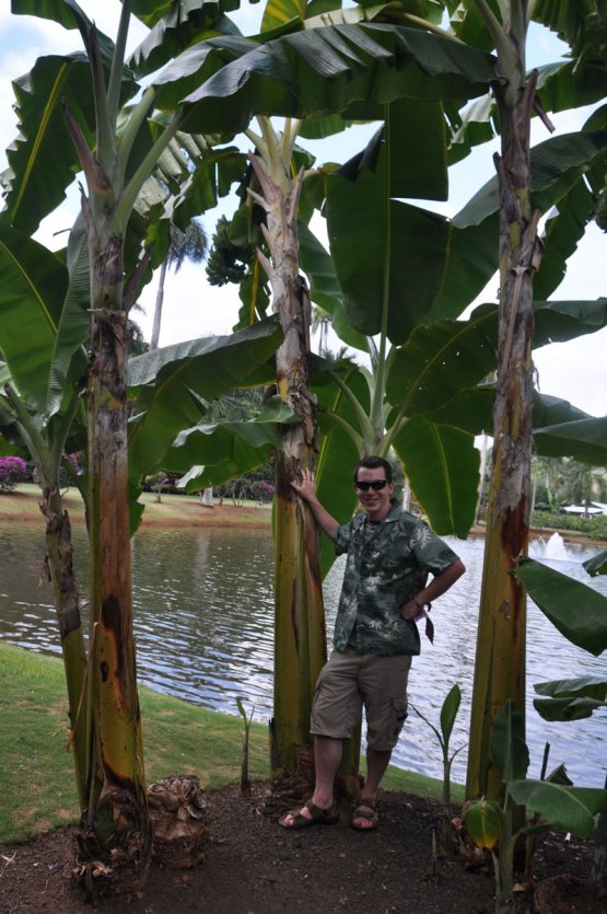 Musa Saba originally comes from the Philippines where it is commonly cooked and eaten as a staple. The plant is very large and sturdy; perhaps one of the largest bananas we've ever seen (note John standing next to one in the photos). It can grow up to 25 feet and is very tolerant to cold and resistant to wind. The trunk can be as thick as 18 inches.