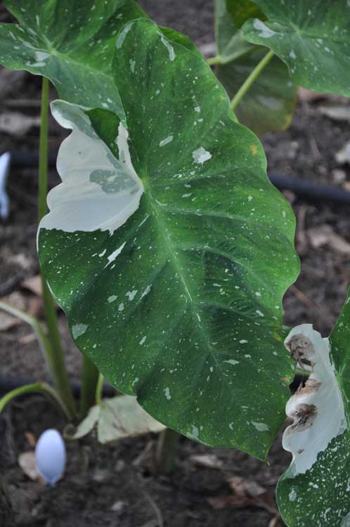 Colocasia Ele Paio or 'Milky Way' is a spectacular rare elephant ear that originally was available only to Hawaiian Royalty. The 3’ tall leaves are heavily spotted with paint-like white flecks; some leave are even entirely white on one side. The markings are random and no two leaves are quite the same.