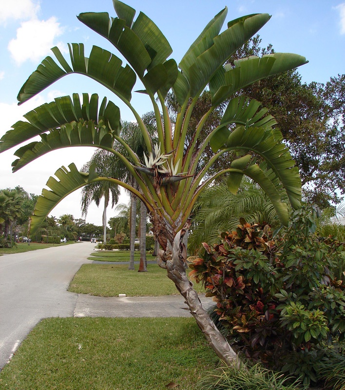 A crown of banana-like leaves atop a palm tree trunk, combined with huge, uniquely beautiful flowers, is deserving of the name, "Bird of Paradise tree." Related to the bird of paradise flower (Strelitzia regina ), this close cousin is a much larger plant forming huge clumps of stems to 30 feet in comparison to S. regina's 3 to 4 feet height.