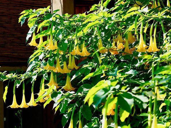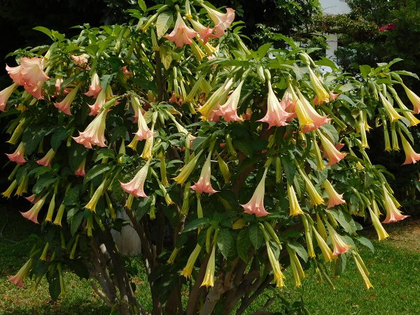 There are literally dozens of hybrids available, with flower coming in shades of white, peach, pink, orange or yellow. The show-stopping hanging trumpet-shaped flowers of angel's trumpet make this a delight for any garden. It is tropical and grows best in gardens in Zone 8-11, but it can be used as a container plant and brought inside when cool. Angel's Trumpets can be grown as either a shrub or a tree.